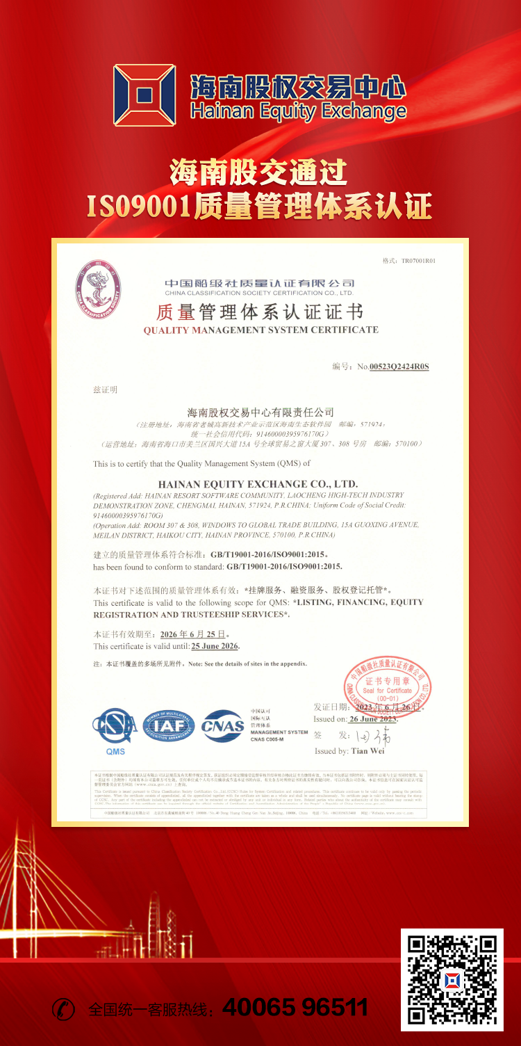 為適應(yīng)市場競爭、提高服務(wù)質(zhì)量和水平,海南股交于2023年年初開始推行公司質(zhì)量管理體系工作,于今年6月成功通過ISO9001質(zhì)量管理體系認證審核并獲發(fā)相關(guān)證書。今年年初以來,海南股交高度重視貫標(biāo)工作,各部門積極參與...