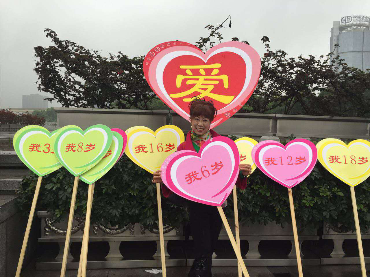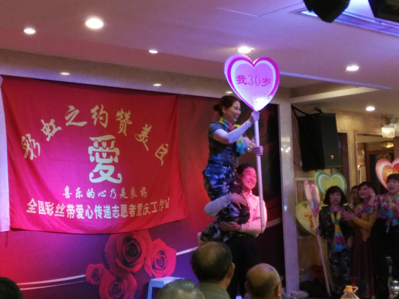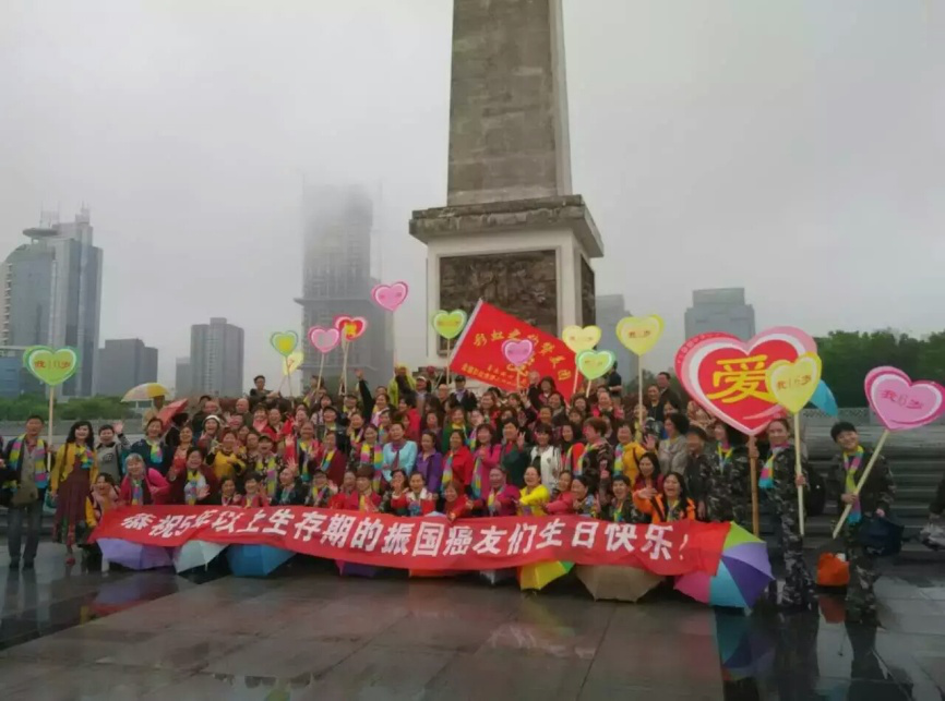 2016年4月10日,全國(guó)彩絲帶愛心傳遞重慶工作站的志愿者們?cè)趦山腋V場(chǎng)為重慶病友(5年以上癌齡)舉辦了一場(chǎng)特別的集體生日,百名癌癥患者齊唱《生日歌》,大呼“我們活了!”