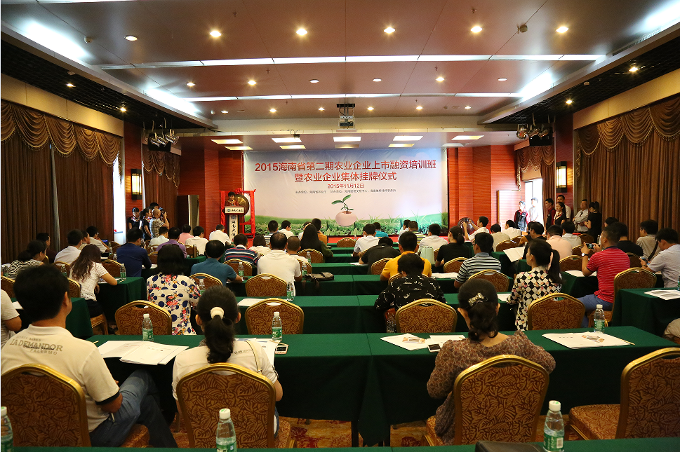 11月12日,由海南省農(nóng)業(yè)廳主辦,海南股權(quán)交易中心協(xié)辦的2015年第二期海南省農(nóng)業(yè)企業(yè)上市融資培訓(xùn)班暨農(nóng)業(yè)企業(yè)集體掛牌儀式在海南大酒店舉行。全省40多家農(nóng)業(yè)企業(yè)有關(guān)負(fù)責(zé)人及管理人員參加了培訓(xùn),23家農(nóng)業(yè)企業(yè)成功掛牌海南股權(quán)交易中心。