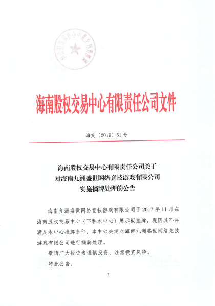 海南股權(quán)交易中心有限責(zé)任公司 關(guān)于對(duì)海南九洲盛世網(wǎng)絡(luò)競(jìng)技游戲有限公司 實(shí)施摘牌處理的公告