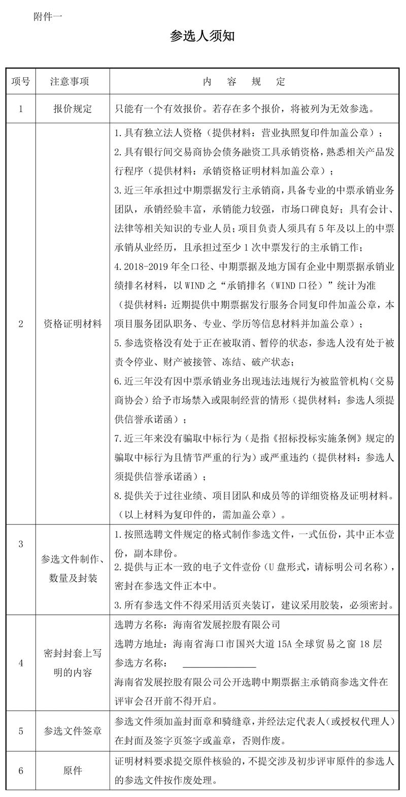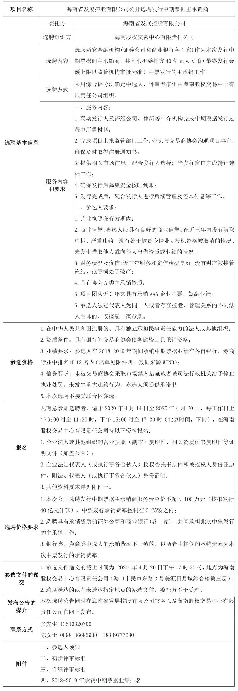 根據(jù)相關法律法規(guī),受委托,海南股權交易中心有限責任公司公開選聘發(fā)行中期票據(jù)主承銷商,為中期票據(jù)發(fā)行提供相關服務。歡迎符合條件的商業(yè)銀行,證券公司遵照本公告的有關規(guī)定報名參加,現(xiàn)將有關事項公告如下: