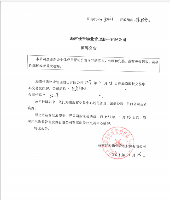 80107 佳禾物業(yè) 海南佳禾物業(yè)管理股份有限公司摘牌公告
