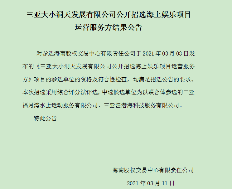 三亞大小洞天發(fā)展有限公司公開招選海上娛樂項(xiàng)目運(yùn)營(yíng)服務(wù)方結(jié)果公告