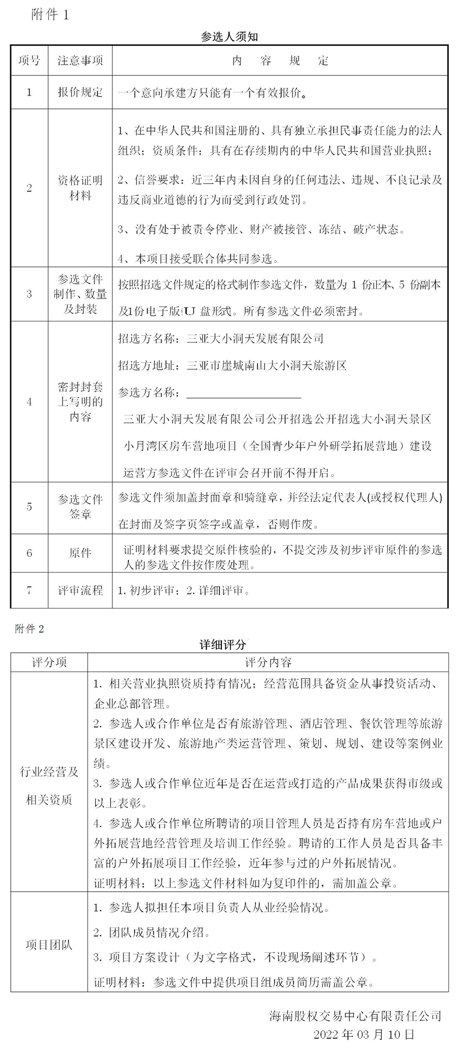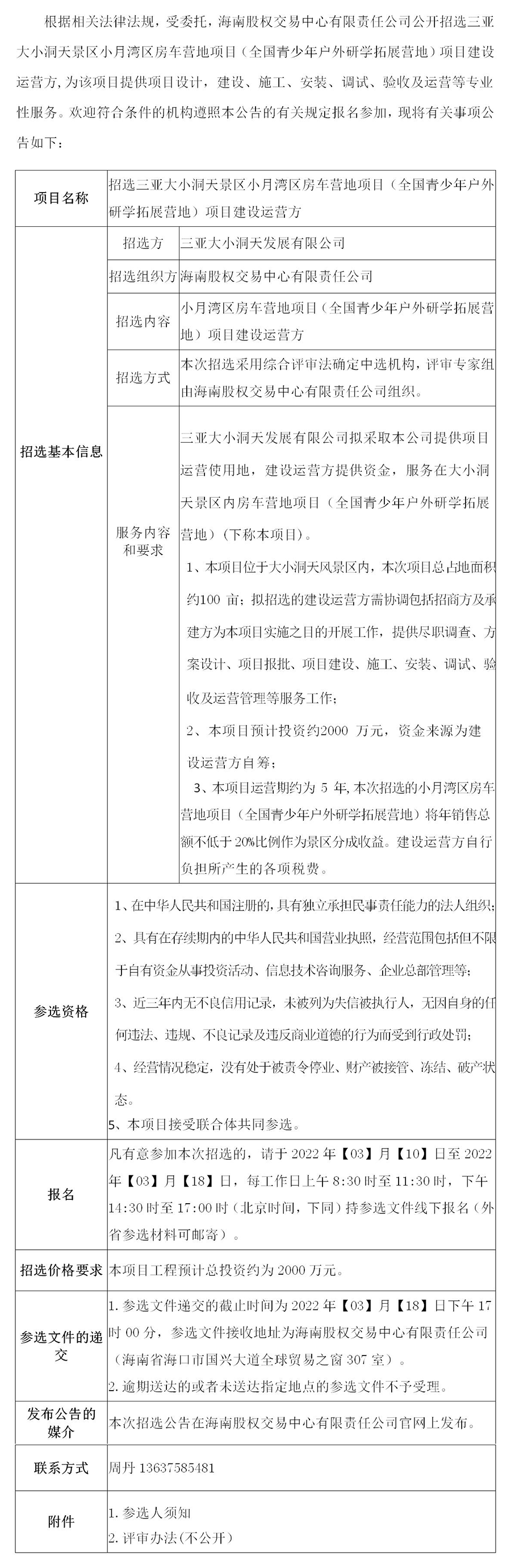 三亞大小洞天發(fā)展有限公司公開招選小月灣區(qū)房車營地項(xiàng)目(全國青少年戶外研學(xué)拓展?fàn)I地)建設(shè)運(yùn)營方
