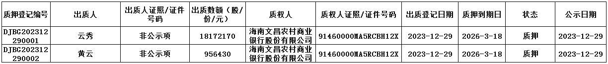 海南勵昌煙花炮竹銷售股份有限公司(企業(yè)代碼:993913)股東云秀、黃云于2023年12月29日在我中心辦理了股權(quán)質(zhì)押登記業(yè)務(wù),具體情況如下: