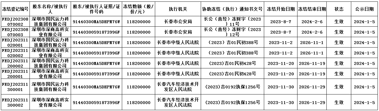 依據(jù)長春市公安局《協(xié)助凍結(jié)財產(chǎn)通知書》[長公(直經(jīng))凍財字〔2023〕11號)]、長春市人民法院《協(xié)助執(zhí)行通知書》[(2023)吉01民初388號]及長春汽車經(jīng)濟技術開發(fā)區(qū)人民法院[(2023)吉0192執(zhí)保1256號]等文件,我中心為??诼?lián)合農(nóng)村商業(yè)銀行股份有限公司(企業(yè)代碼:893529)股東深圳市國民運力科技集團有限公司、深圳市深商高科實業(yè)有限公司辦理股權凍結(jié)/股權輪候凍結(jié)登記,具體情況如下: