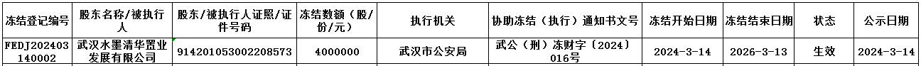 依據(jù)武漢市公安局《協(xié)助凍結(jié)財(cái)產(chǎn)通知書(shū)》[武公(刑)凍財(cái)字〔2024〕016號(hào)]文件,我中心為海南昌江長(zhǎng)江村鎮(zhèn)銀行股份有限公司(企業(yè)代碼:893521)股東武漢水墨清華置業(yè)發(fā)展有限公司辦理股權(quán)凍結(jié)登記,具體情況如下: