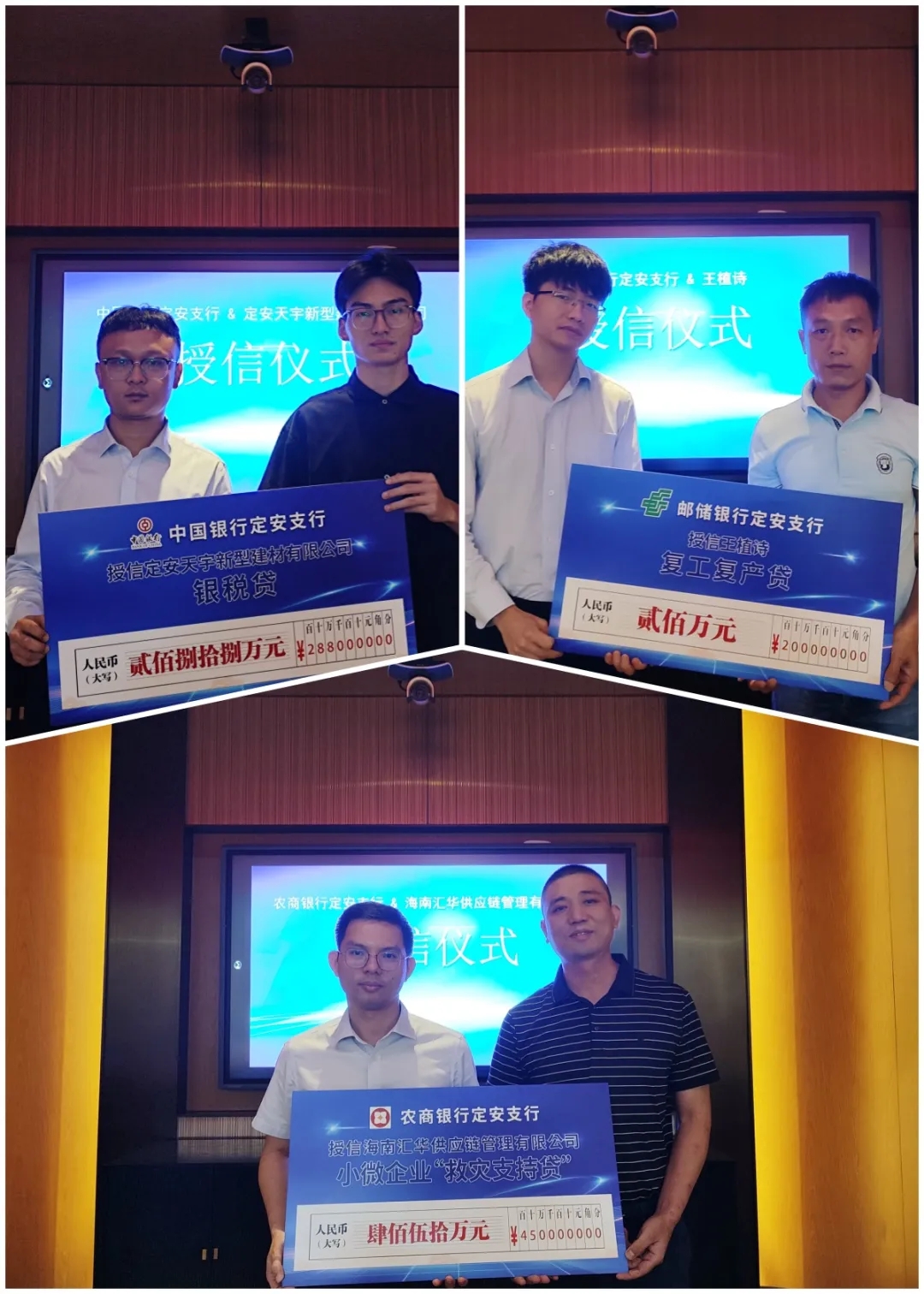 為幫助定安企業(yè)提供金融支持,中國銀行、中國建設(shè)銀行、中國農(nóng)業(yè)銀行、中國郵儲銀行、海南農(nóng)商行、海南銀行等金融機(jī)構(gòu)分別介紹了各自專屬的金融產(chǎn)品和服務(wù),并就救災(zāi)貸、復(fù)工復(fù)產(chǎn)貸及開通融資綠色通道的申請條件、辦理流程、貸款額度、貸款期限、貸款利率和政府貼息等問題進(jìn)行了詳細(xì)介紹。