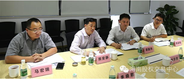 4月13日下午,由海南省人民政府研究室副主任熊安靜帶隊(duì)的省金融辦、省旅游委調(diào)研組一行,到海南股權(quán)交易中心走訪調(diào)研。海南股權(quán)交易中心董事長李曉剛,組織各部門負(fù)責(zé)人召開座談會(huì),詳細(xì)介紹了本中心的運(yùn)行情況。