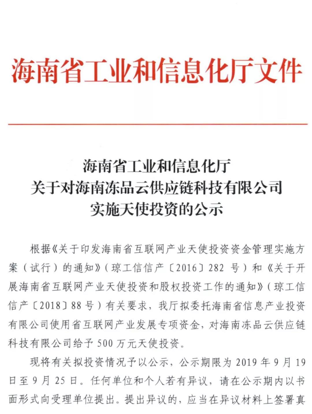 近期,海南省工業(yè)和信息化廳發(fā)布關(guān)于對海南股權(quán)交易中心掛牌企業(yè)海南凍品云供應(yīng)鏈科技有限公司實施天使投資的公示,擬委托海南省信息產(chǎn)業(yè)投資有限公司使用省互聯(lián)網(wǎng)產(chǎn)業(yè)發(fā)展專項資金,對海南凍品云供應(yīng)鏈科技有限公司...