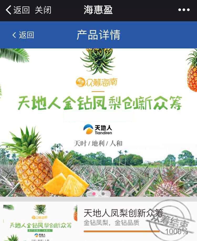 3月22日,海南股權(quán)交易中心天地人鳳梨創(chuàng)新眾籌項目圓滿結(jié)束,計劃眾籌金額10萬元,項目上線僅5分鐘,成功募集金額100萬元,是預(yù)期目標(biāo)金額的10倍。天地人鳳梨眾籌項目,是股交中心2018年在海惠盈平臺上線的首單創(chuàng)新...