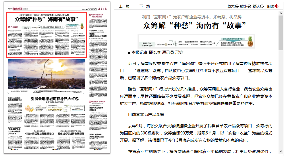 12月13日,海南日報在經(jīng)濟版刊發(fā)文章《利用“互聯(lián)網(wǎng)+”為農(nóng)戶和企業(yè)籌資本、拓銷路、樹品牌——眾籌解“種愁”海南有“故事”》,大篇幅報道了海南股權(quán)交易中心“眾籌海南”。