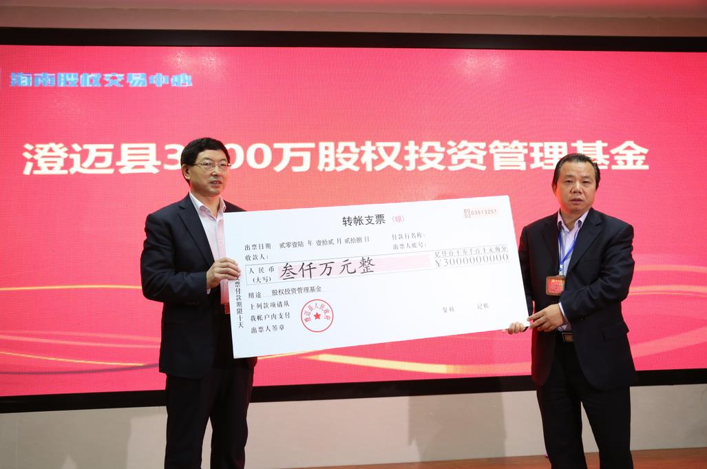 為了加強澄邁縣與股交中心的合作,現(xiàn)場,鄭奮與李曉剛共同簽署了戰(zhàn)略合作協(xié)議。隨后,楊思濤代表澄邁縣政府向海南控股發(fā)放澄邁縣3000萬股權投資管理資金,并由柳松華代表海南控股接收。