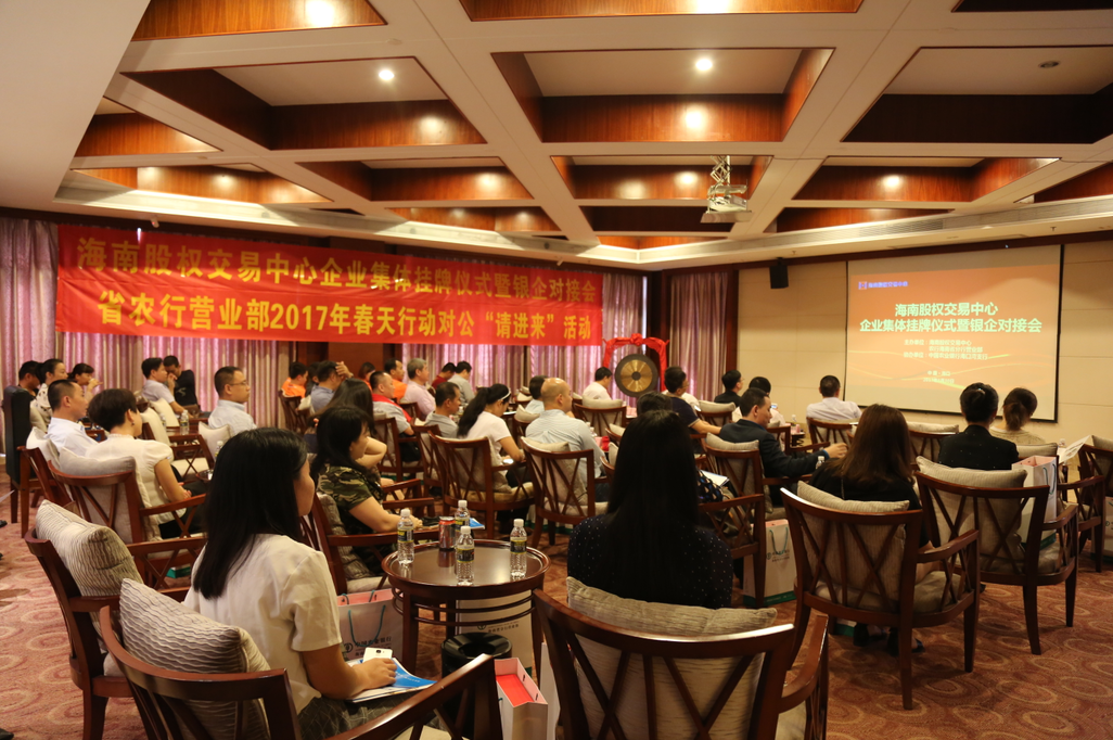 3月30日上午,由海南股權(quán)交易中心和中國(guó)農(nóng)業(yè)銀行海南省分行營(yíng)業(yè)部共同主辦的企業(yè)集體掛牌儀式暨銀企對(duì)接會(huì),在中國(guó)農(nóng)業(yè)銀行海口灣支行順利舉行。海南股權(quán)交易中心副總經(jīng)理程棟才,中國(guó)農(nóng)業(yè)銀行海南省分行營(yíng)業(yè)部總經(jīng)理林道冠、副總經(jīng)理林敏,中國(guó)農(nóng)業(yè)銀行海南省分行小微企業(yè)部副總經(jīng)理陳沖,以及50家企業(yè)代表共同參加本次對(duì)接會(huì)。