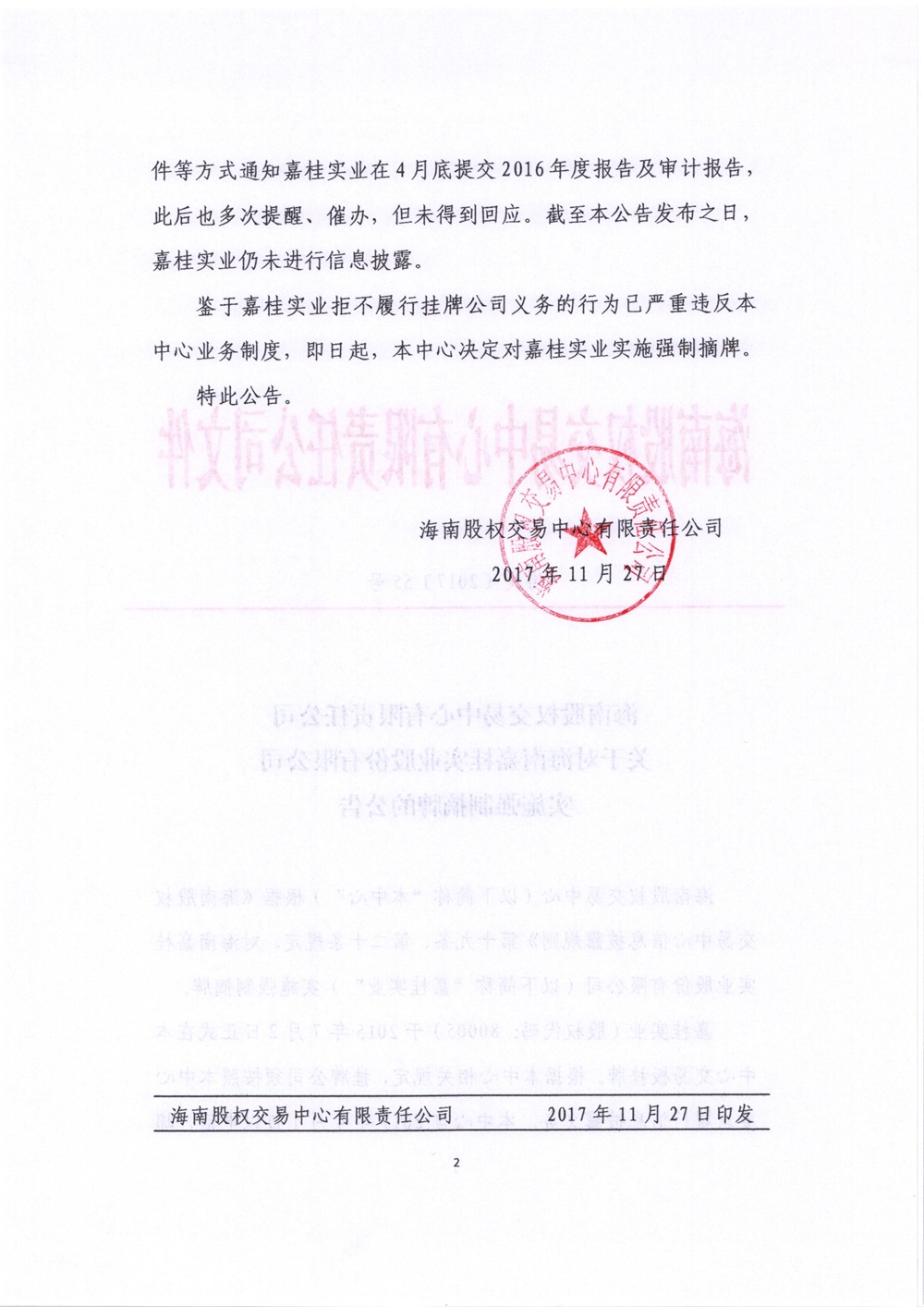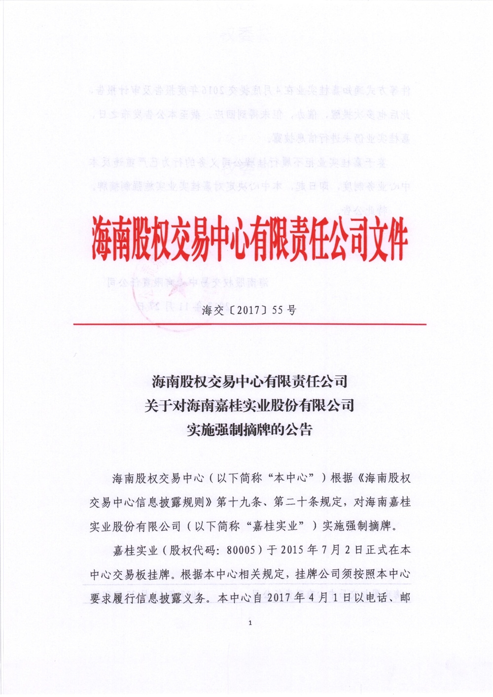 80005嘉桂實(shí)業(yè):關(guān)于對(duì)海南嘉桂實(shí)業(yè)股份有限公司實(shí)施強(qiáng)制摘牌的公告
