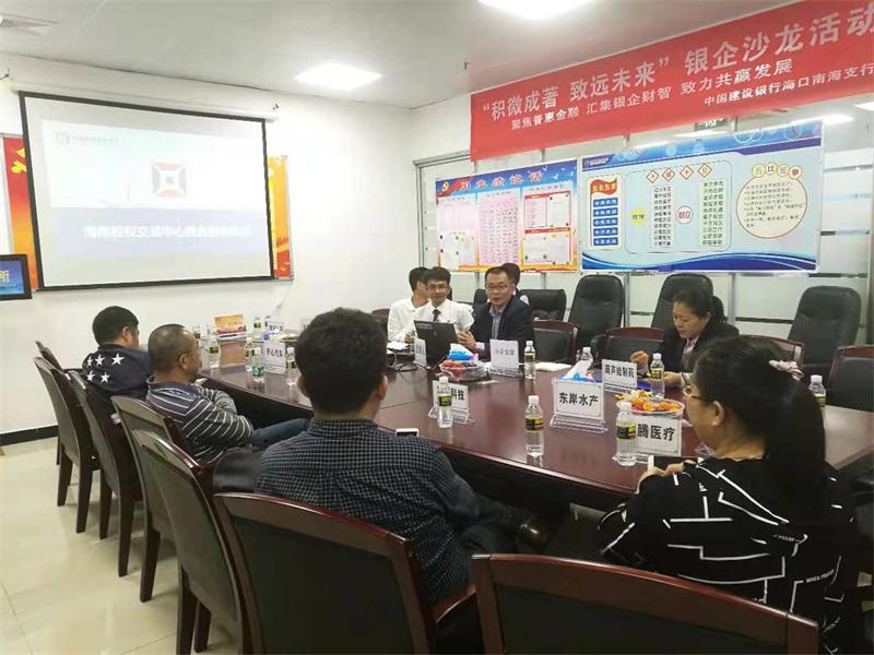 為貫徹黨中央支持民營(yíng)企業(yè)發(fā)展方針,幫助小微企業(yè)解決融資難、融資貴、融資慢等問題,加速推進(jìn)普惠金融戰(zhàn)略,海南股權(quán)交易中心(簡(jiǎn)稱“海南股交”)與中國(guó)建設(shè)銀行??谀虾V校ê?jiǎn)稱“建行南海支行”)于11月27日下午舉辦小微企業(yè)“銀企沙龍”活動(dòng),應(yīng)邀的18家企業(yè)代表出席了此次活動(dòng)。
