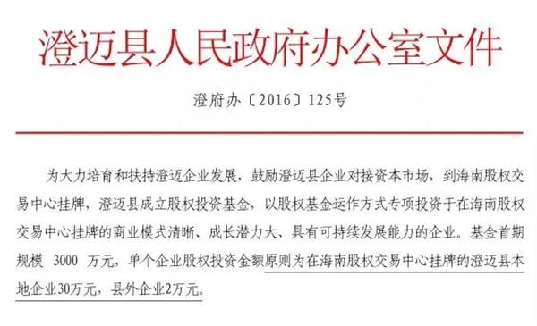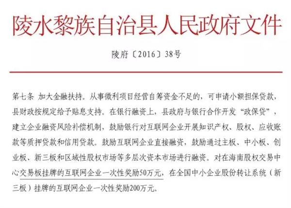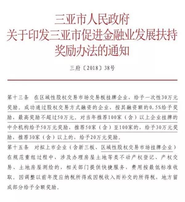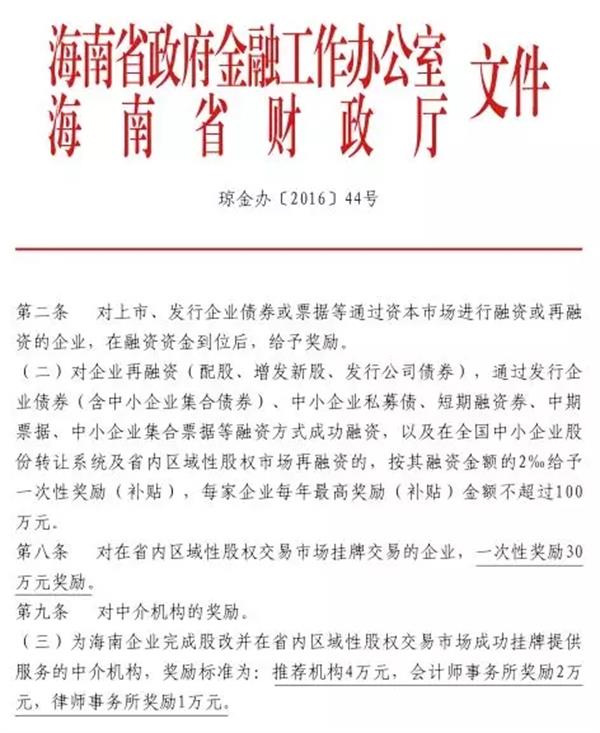 在國(guó)家采取精準(zhǔn)有效措施大力支持中小微企業(yè)發(fā)展,解決中小微企業(yè)融資難、融資貴難題的大背景下。從2015年開始,海南省各級(jí)政府密集出臺(tái)鼓勵(lì)企業(yè)掛牌區(qū)域性股權(quán)交易市場(chǎng)(即四板市場(chǎng))的政策。同時(shí),在股份改制、掛牌、融資等方面,給予掛牌企業(yè)財(cái)政獎(jiǎng)勵(lì),以實(shí)際行動(dòng)助力中小微企業(yè)對(duì)接資本市場(chǎng),做大做強(qiáng)。