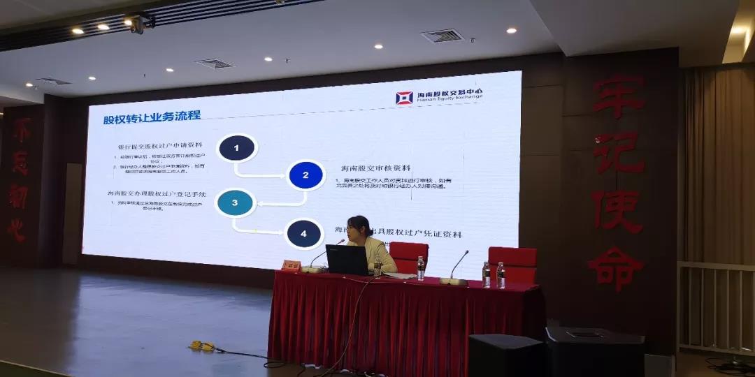 培訓(xùn)會上,海南股交總經(jīng)理助理卜麗麗向現(xiàn)場參會人員介紹了商業(yè)銀行股權(quán)登記托管的重要性和必要性。她表示,股權(quán)登記托管是區(qū)域性股權(quán)交易市場的一項(xiàng)基礎(chǔ)工作,也是主要業(yè)務(wù)之一。海南股交作為省內(nèi)唯一合法的區(qū)域性股權(quán)交易市場運(yùn)營機(jī)構(gòu),成立至今,股權(quán)托管企業(yè)共計(jì)90家,托管總股本達(dá)67.05億股,積累了豐富的股權(quán)托管工作經(jīng)驗(yàn)。2018年,海南銀行股份有限公司在海南股交成功辦理股權(quán)登記托管手續(xù),成為省內(nèi)首家完成股權(quán)登記托管的法人銀行,標(biāo)志著海南省銀行股權(quán)登記托管業(yè)務(wù)實(shí)現(xiàn)零的突破。