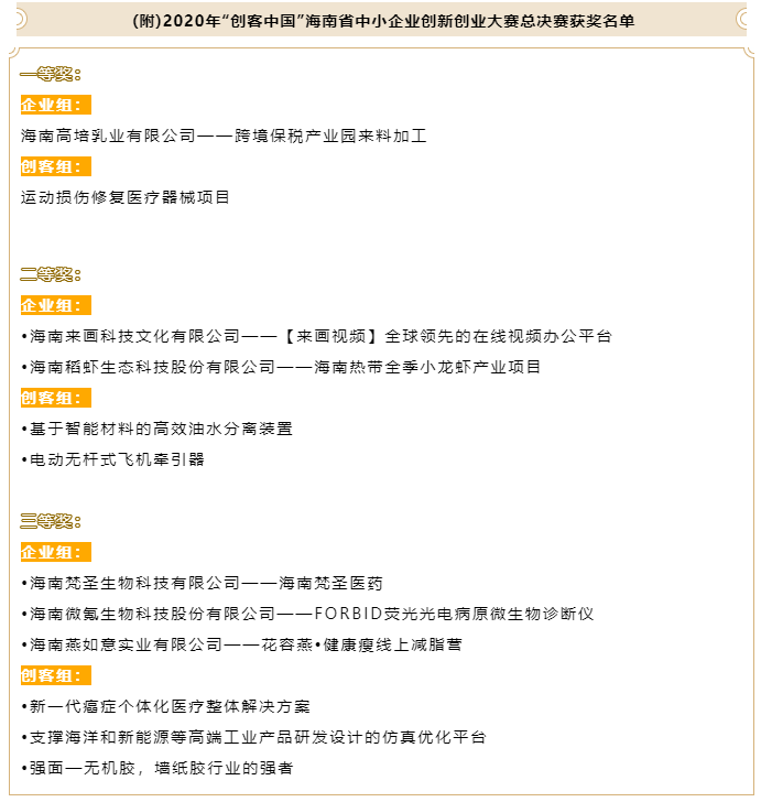 逐夢自貿港,創(chuàng)贏海之南。8月26日下午,由海南省工業(yè)和信息化廳、海南省財政廳主辦,海南股權交易中心承辦、深圳證券信息有限公司、陵水互聯網創(chuàng)業(yè)產業(yè)園協辦的2020年“創(chuàng)客中國”海南省中小企業(yè)創(chuàng)新創(chuàng)業(yè)大賽總決賽暨項目融資路演在海口舉行。通過2天近15個小時的路演和現場答辯,30強項目現場PK、同臺競技,最終,“跨境保稅產業(yè)園來料加工”和“運動損傷修復醫(yī)療器械”項目分獲海南賽區(qū)決賽企業(yè)組和創(chuàng)客組一等獎。