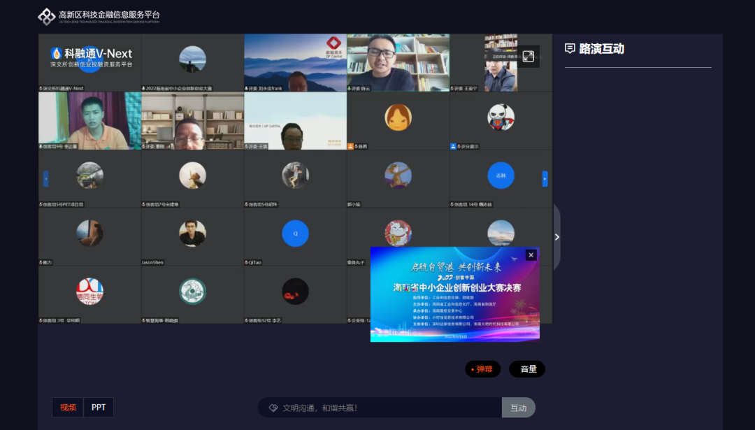根據(jù)海南疫情防控需要,為降低傳播風險,切實將各項防控措施落實到位,海南賽區(qū)決賽首次采取“線上路演+遠程評審”的模式進行,路演企業(yè)及評委登錄騰訊會議室,全程線上路演及答辯。值得一提的是,決賽路演同步登錄深交所科融通平臺,直面全國7300多家主流的創(chuàng)投機構(gòu)和2500多家上市公司。